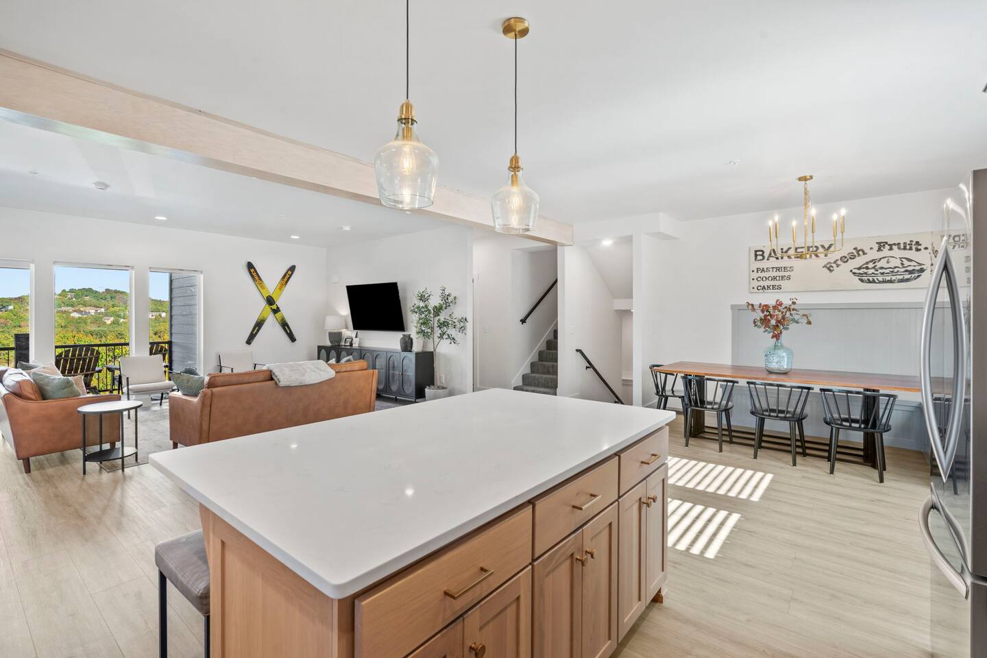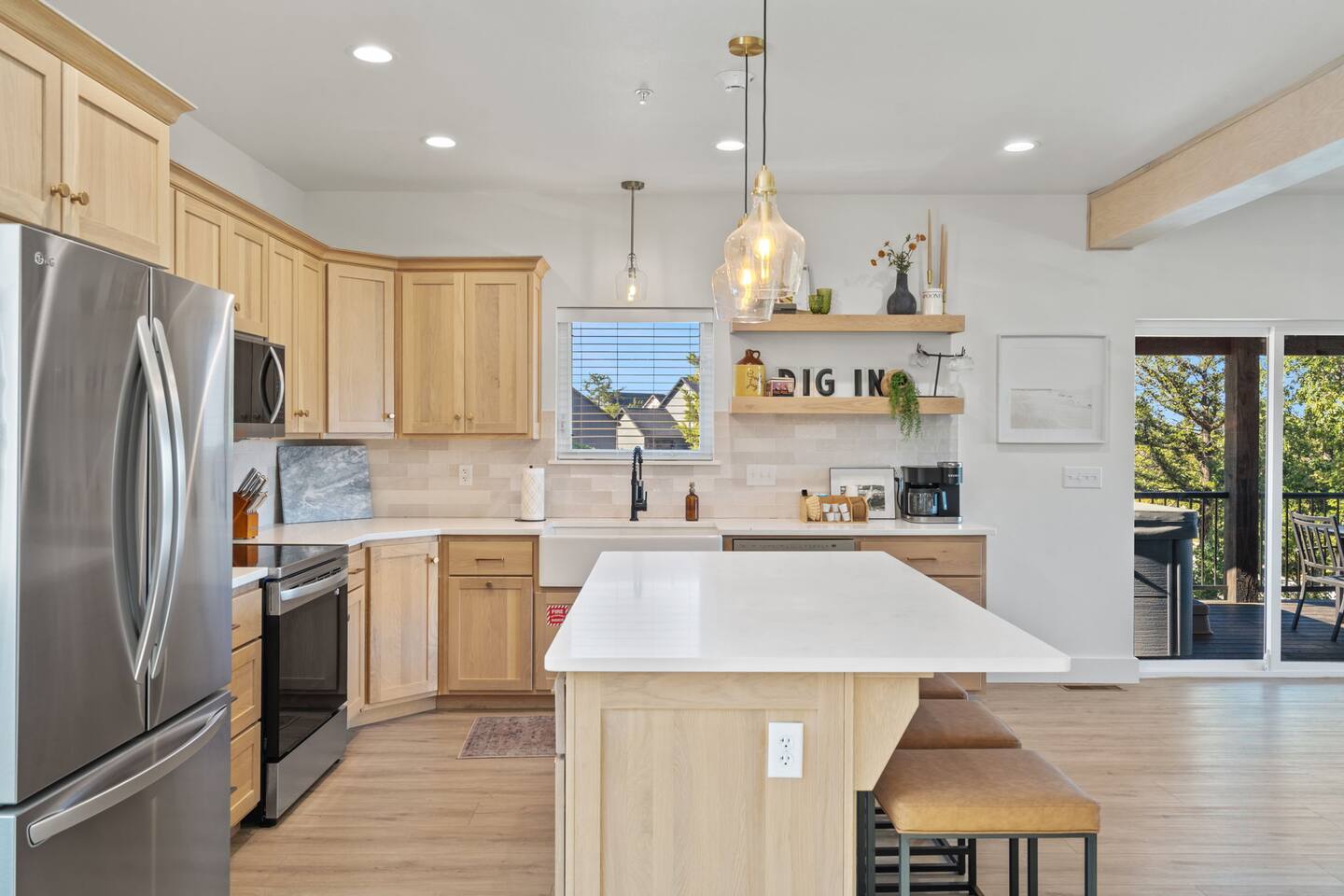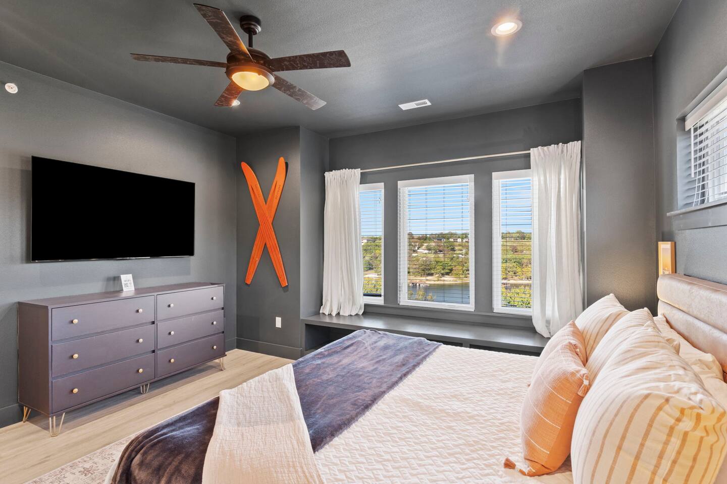 Our home is a haven of comfort and privacy. With four bedrooms, four en suite bathrooms, one room being a charming bunk room, a theater, hot tub, and lake views, it's a retreat for those seeking a peaceful getaway. The open floor plan connects the living, dining, and kitchen areas, creating a warm and welcoming space for relaxation and socializing. The fully equipped kitchen features modern appliances and ample counter space, making it a haven for those who simply enjoy preparing meals together.