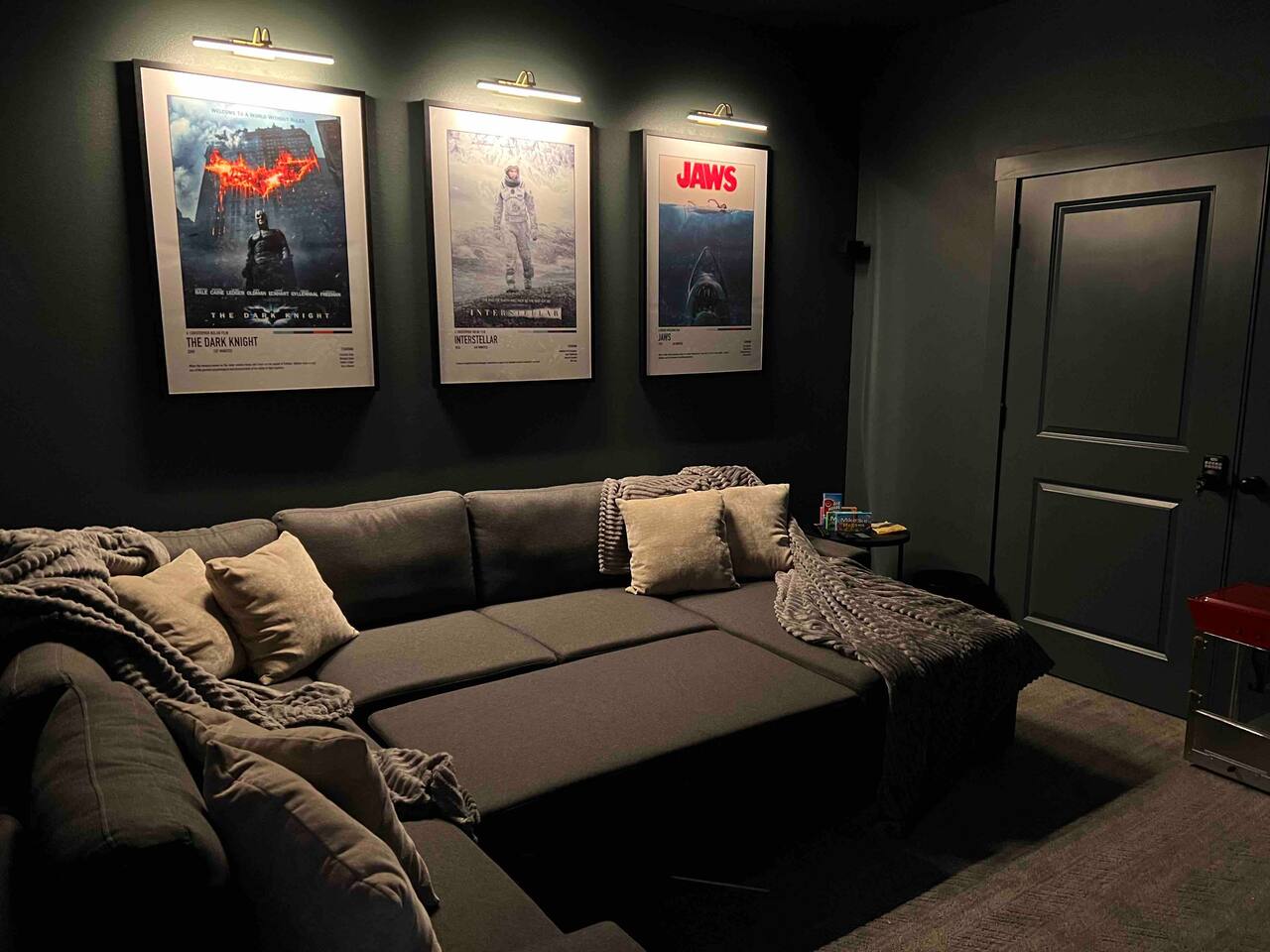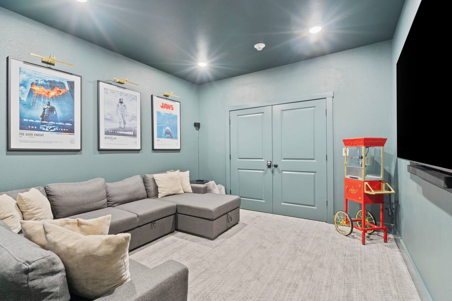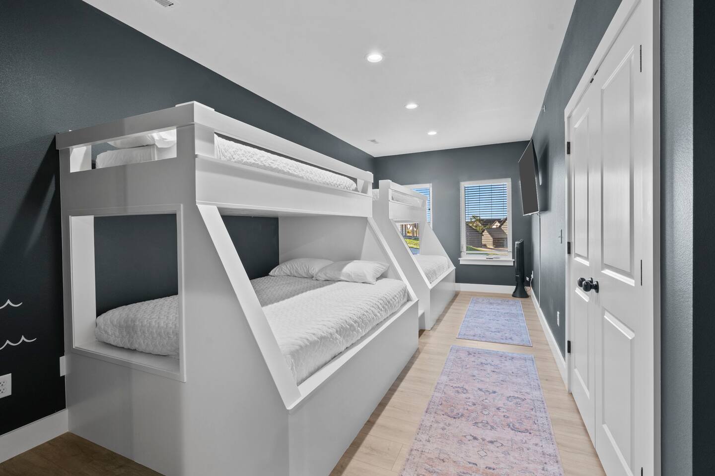 Four bedrooms with their own bathrooms attached. 3 of the bedrooms have king beds. The bunk room has two queen beds on bottom and two twins on top. Each room has a 65" TV. The movie room has a large sectional with a 75" TV. Large kitchen with all major appliances, blender, crockpot, griddle. There is a community outdoor pool that is open from Memorial Day to Labor Day. The two car garage is converted into a game room